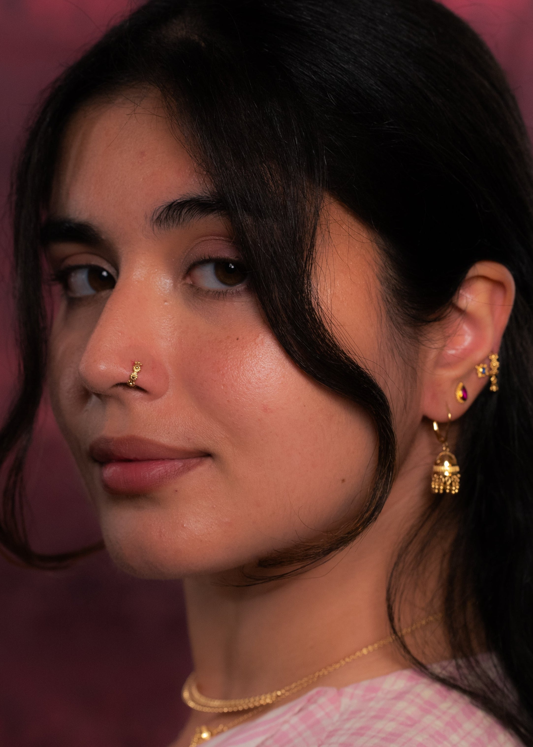 Meet the Raveena Nose Hoop. Inspired by our best-selling Zaria Hoop, this nose hoop has a splendid sunflower inspired design without the dangle for a simple, yet statement-making look. Sold as an individual.