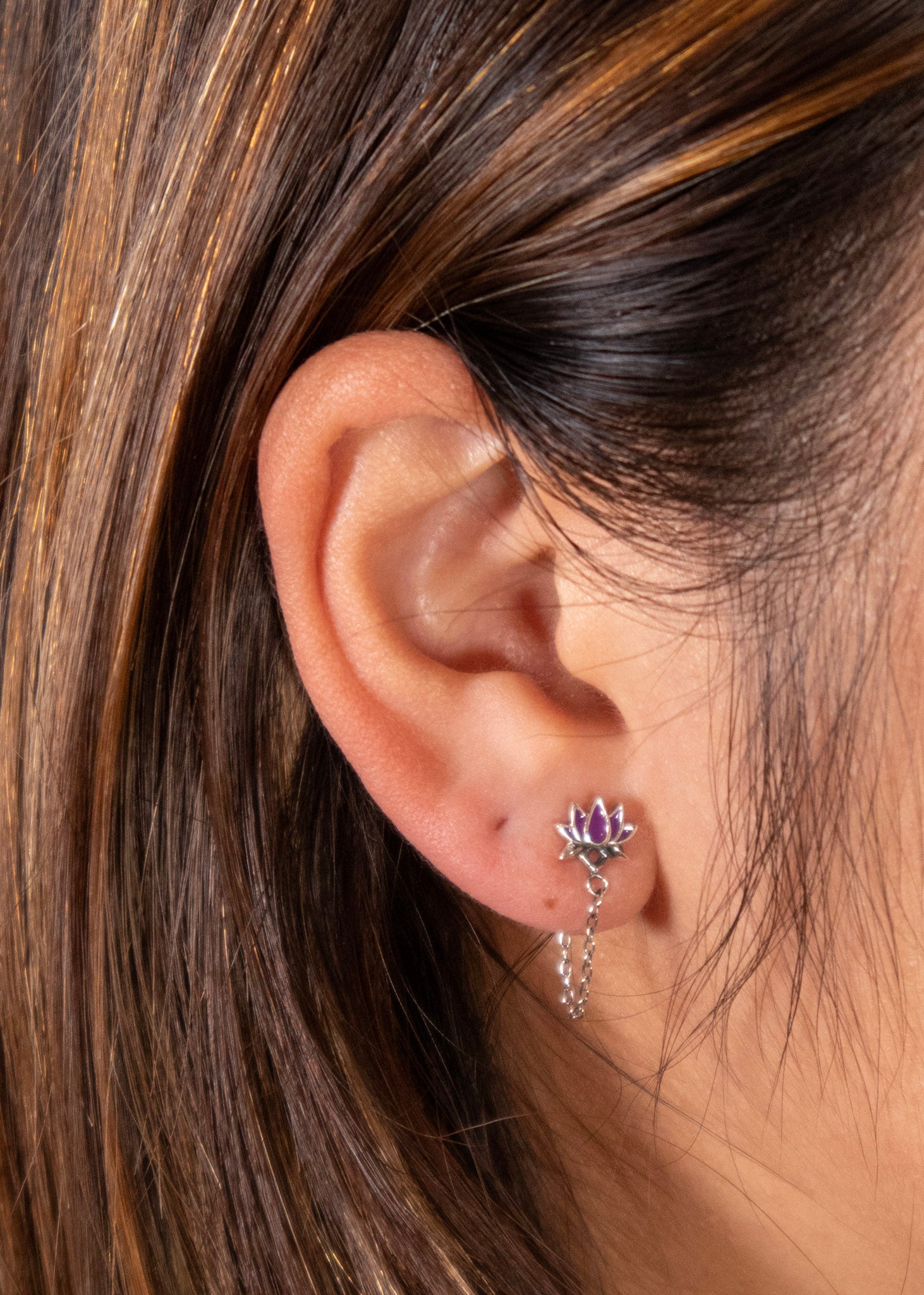 Meet the Padma Stud. The beautiful lotus flower, with a vibrant purple hue, takes center stage of this earring. This earring features an attached chain that can be looped to itself or to another earring. The visual intrigue to this piece makes it perfect for stacking. Sold as an individual or in pairs.