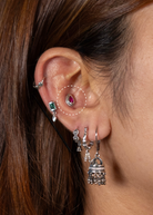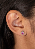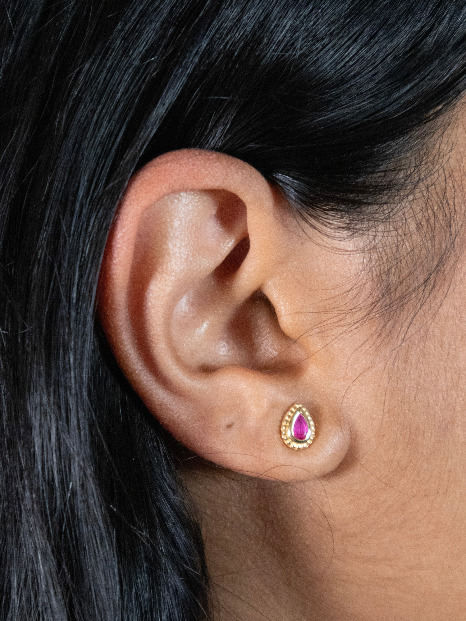 Meet the Sunita Ear Stud. This ear stud features a tear-drop shaped magenta ruby gem encased in an ornate gold frame. This earring is the perfect addition to your outfit whether you're wearing it as a stacking piece or letting it shine on its own. Sold as an individual or as a pair.