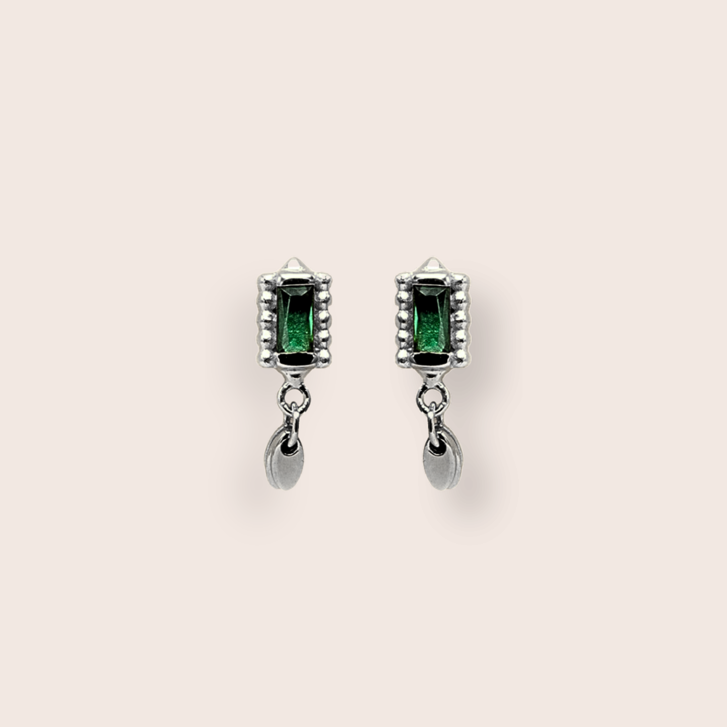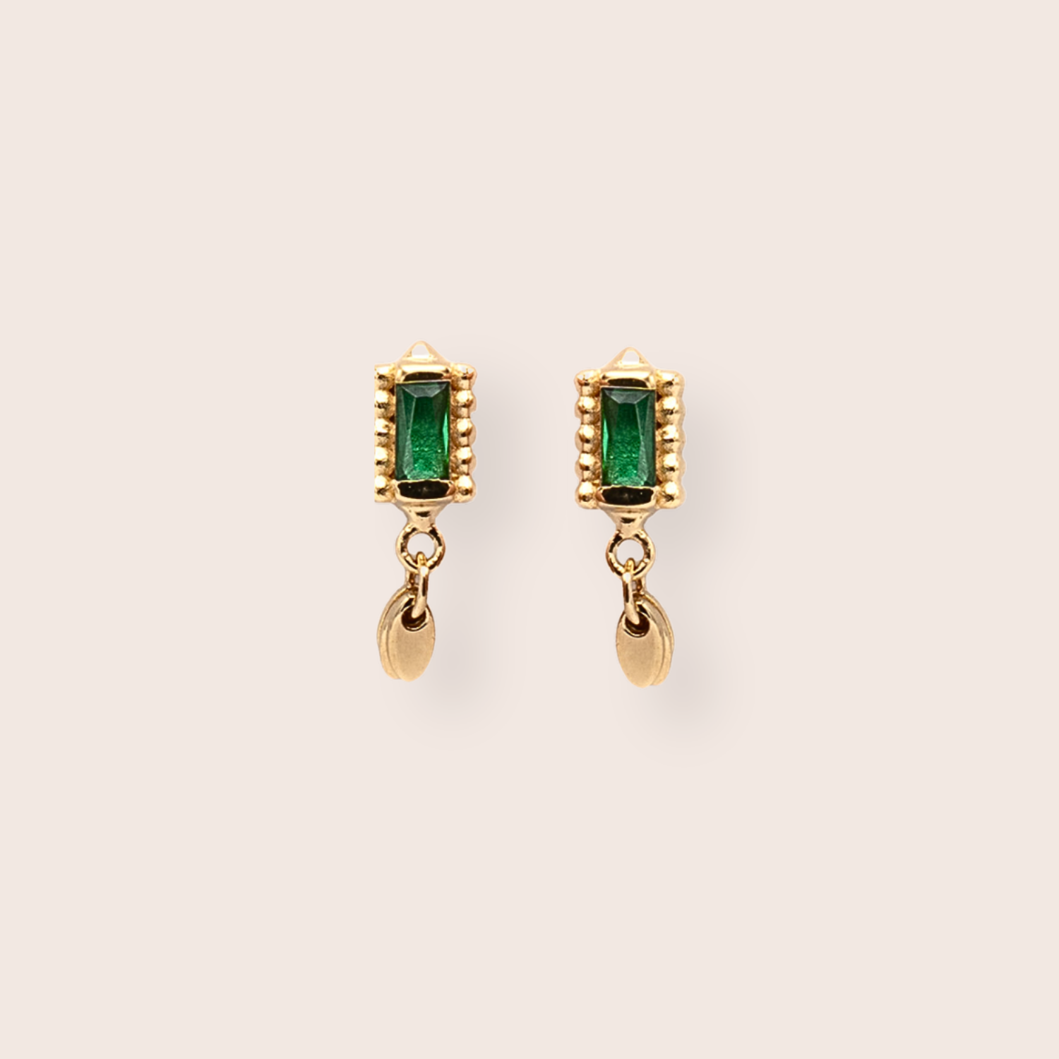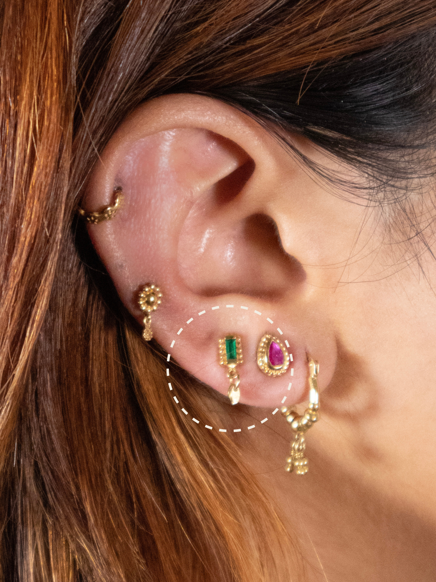 Meet the Tejal Ear Stud. This ear stud features a rectangular emerald gem encased in an ornate gold frame. This earring is the perfect addition to your outfit whether you're wearing it as a stacking piece or letting it shine on its own. Sold as an individual or as a pair.