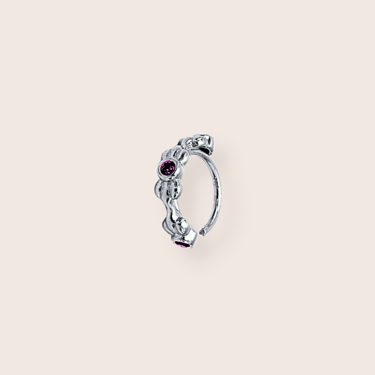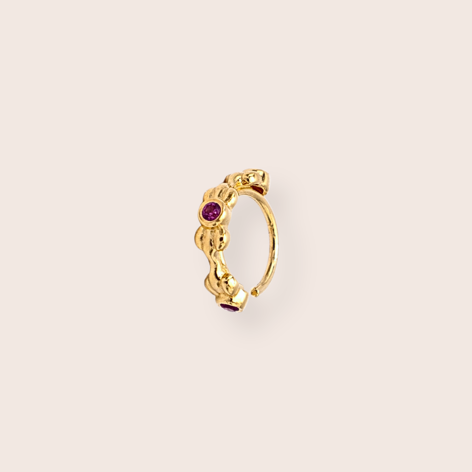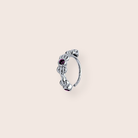 Meet the Sanaa Hoop. Wear it as a nose ring, or as a micro hoop in your ear. This design features a delicate flower motif throughout the hoop with red gems. Sold as an individual.