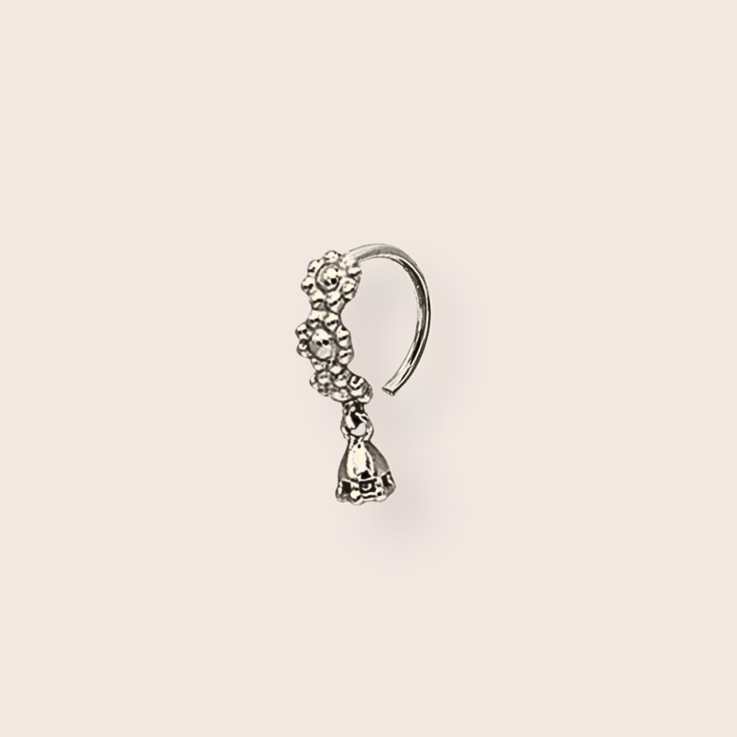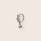 Meet the Zaria Hoop. Wear it as a nose ring, or as a micro hoop in your ear. This design features a flower motif hoop and a small jhumka dangle. Sold as an individual.