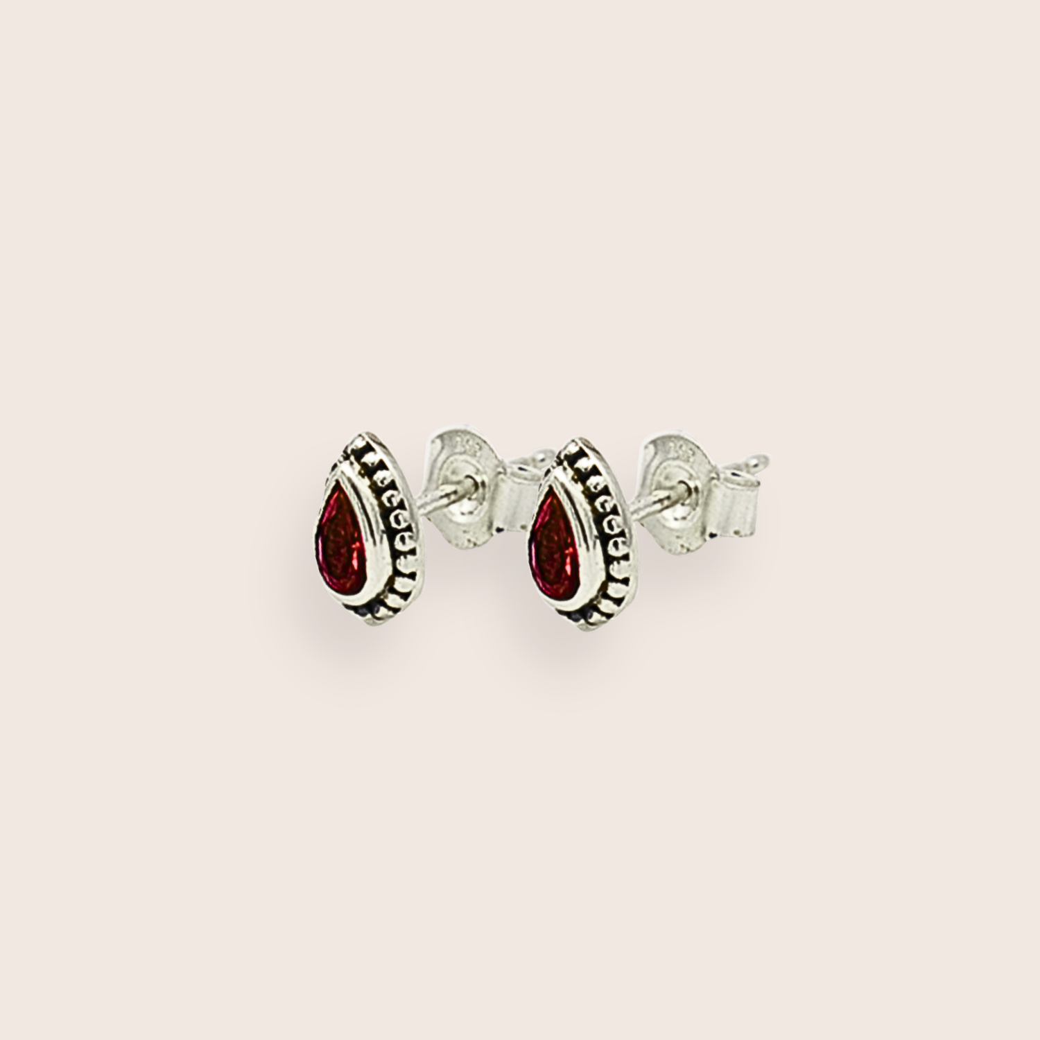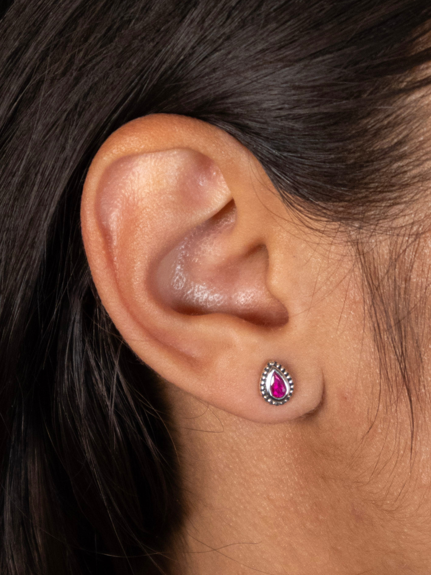 Meet the Sunita Ear Stud. This ear stud features a tear-drop shaped magenta ruby gem encased in an ornate gold frame. This earring is the perfect addition to your outfit whether you're wearing it as a stacking piece or letting it shine on its own. Sold as an individual or as a pair.