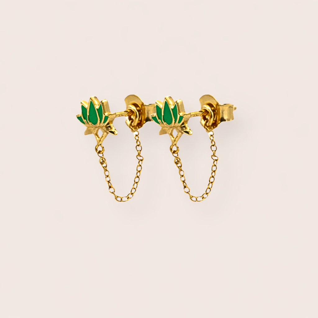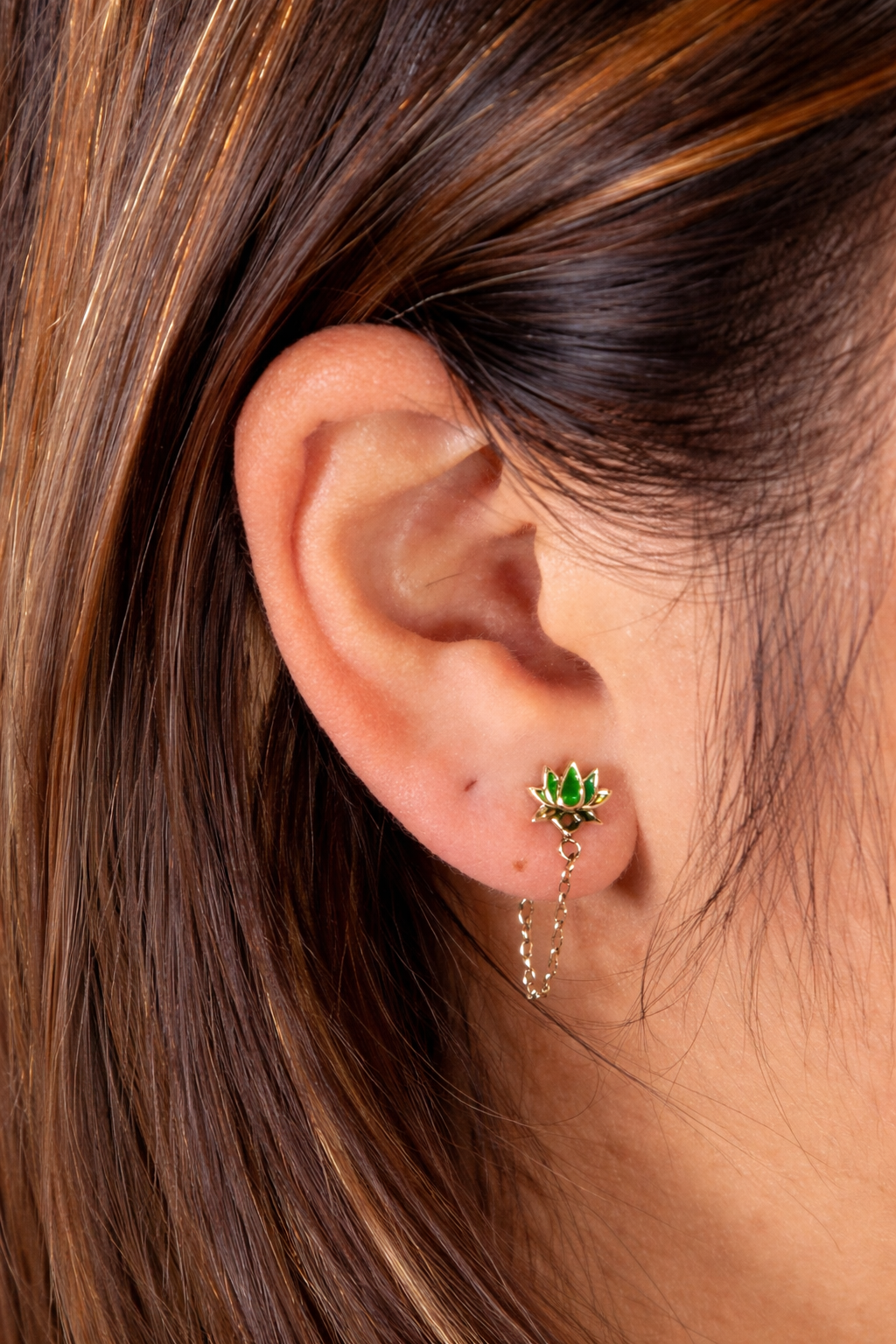 Meet the Limited Edition Padma Stud. The beautiful lotus flower, with a vibrant green hue, takes center stage of this earring. This earring features an attached chain that can be looped to itself or to another earring. The visual intrigue to this piece makes it perfect for stacking. Sold as an individual or in pairs.